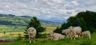 Wir halten Mutterkühe und einen Stier des Charolais-Rinds. Diese spezielle Rasse stammt ursprünglich aus Frankreich, wo man sie früher auch für die Feldarbeit einsetzte. Die Tiere sind gutmütig und ruhig. Sie haben ein crèmefarbiges Fell und einen robusten, muskulösen Körper.