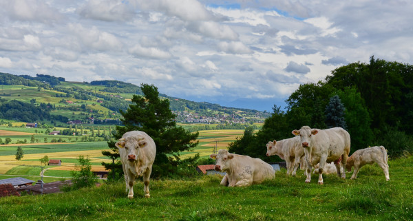 Wir halten Mutterkühe und einen Stier des Charolais-Rinds. Diese spezielle Rasse stammt ursprünglich aus Frankreich, wo man sie früher auch für die Feldarbeit einsetzte. Die Tiere sind gutmütig und ruhig. Sie haben ein crèmefarbiges Fell und einen robusten, muskulösen Körper.
