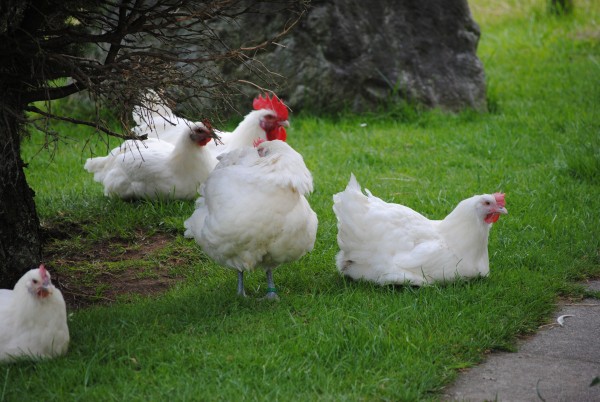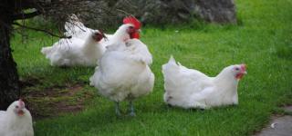 Unsere ca. 50 Hühner von den Rassen Bresse und Auracaner bewegen sich im Freiland. Sie werden von 3 bis 5 Hähnen begleitet, die für den notwendigen Nachwuchs sorgen.